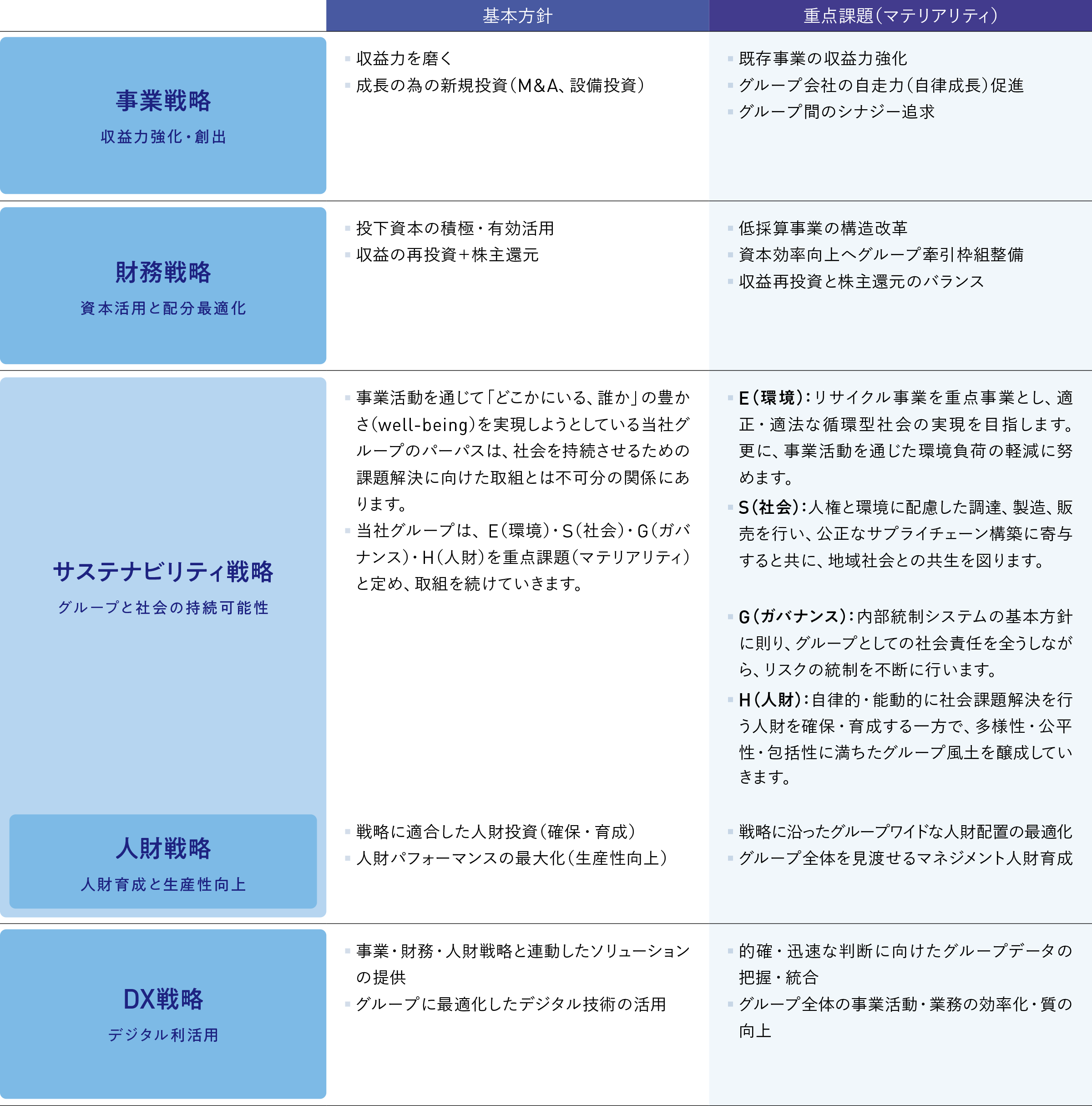- グループの持続的な事業成長を支える経営基盤を充実させ、事業活動を通じた社会の課題解決への貢献を果たす