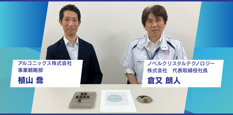 商社を源流とするアルコニックスグループが投資先にできることは一体何なのか。CVCの出資先で、次世代の半導体ウェハー素材「β型酸化ガリウム(β-Ga₂O₃、以下 酸化ガリウム)」(※)の製造開発を手がけるスタートアップ、ノベルクリスタルテクノロジー株式会社(以下、ノベル社)の倉又社長と、アルコニックスの事業戦略部・植山さんにお話を伺いました。