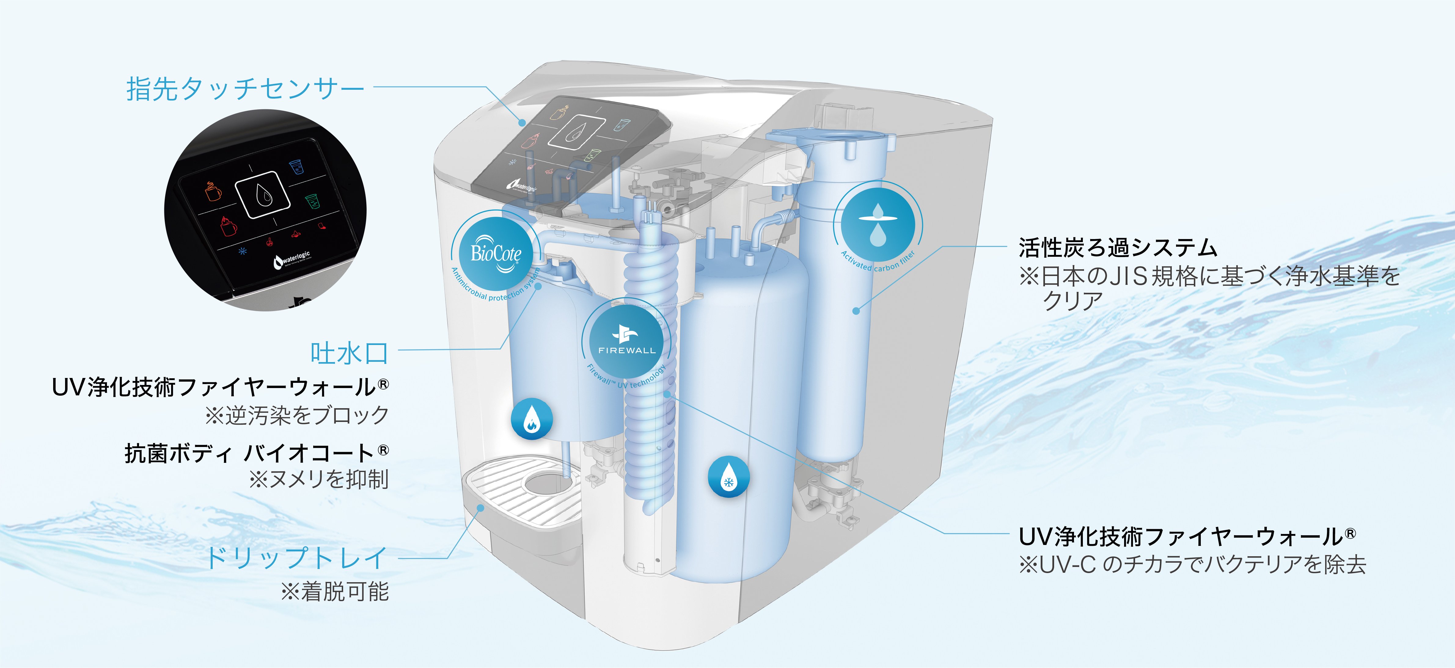 ・UV-C除菌技術「Firewall®」:吐水口の先端でUV-C(紫外線C波)を照射し、水が出る直前まで除菌。サーバー内部だけでなく、雑菌が繁殖しやすい吐水口周辺も常に清潔に保ち、高い衛生性を維持します。