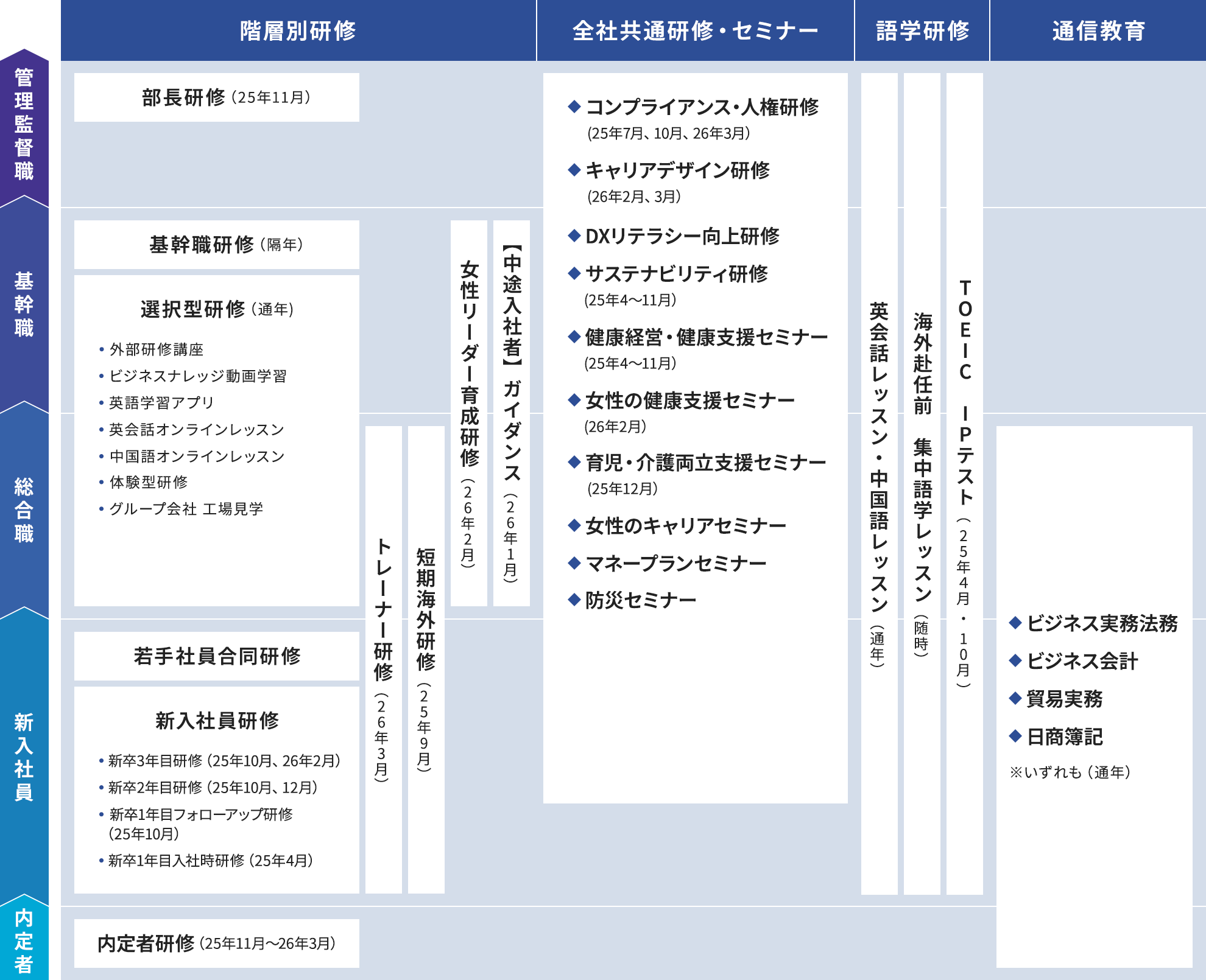 * 就労時間内の教育研修のみ集計。他に自己啓発の語学研修等あり。