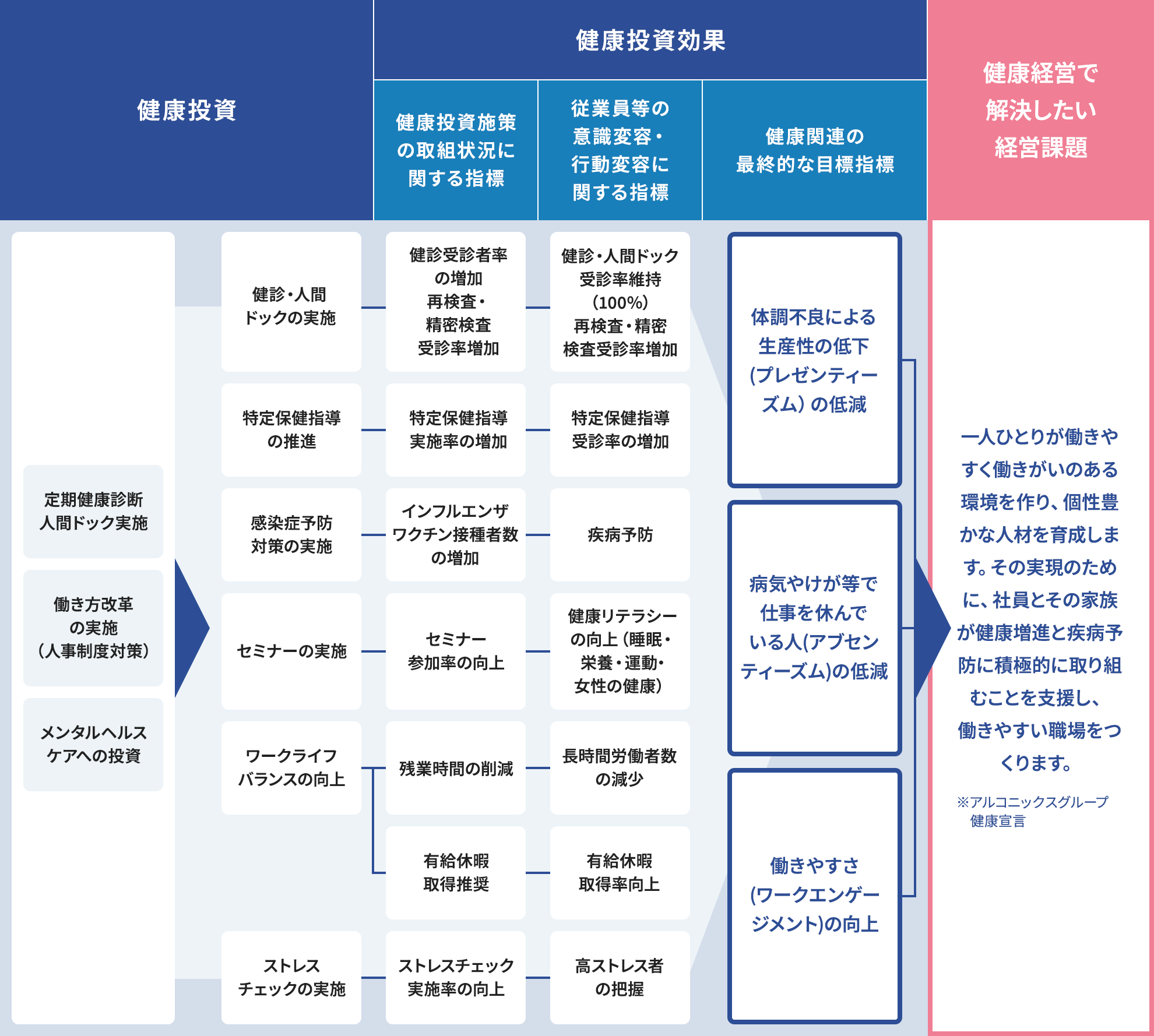 「アルコニックスグループ健康宣言」のとおり、従業員が能力を最大限発揮するための環境整備と人財育成を強化していきます。そのためには、従業員とその家族の心身の健康が重要です。一人ひとりが生き生きと働ける職場づくりを実践し、健康経営を推進していきます。